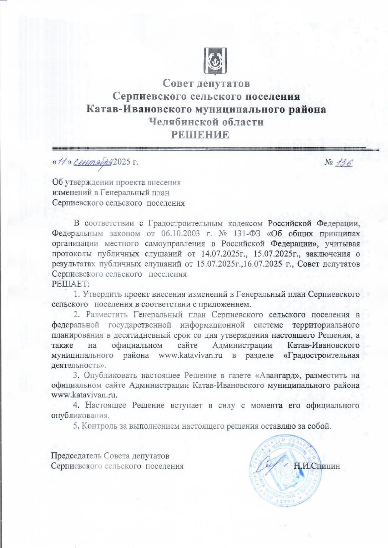Решение об утверждении ГП Серпиевского сп №136 от 11.09.2025 г. (422.6 КБ) | 422.6 КБ |