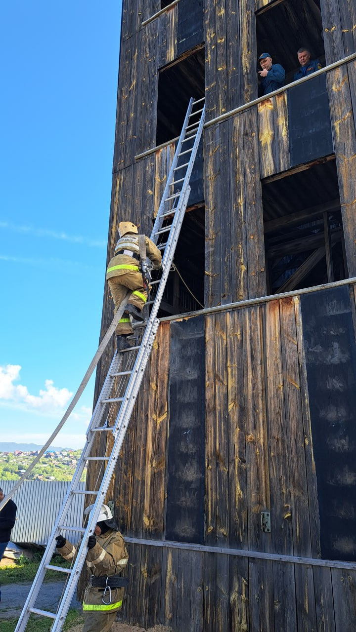 Следующий этап – пожарно-строевая подготовка. Участники на время надевали боевую одежду, вязали спасательную петлю, поднимались по трехколенной лестнице в окно 3-го этажа учебной башни, а также преодолевали 100-метровую полосу препятствий.
