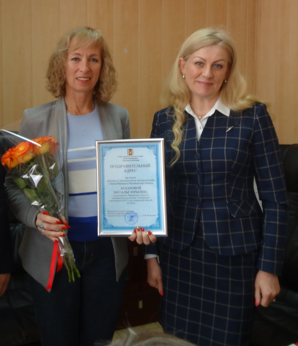Далее, по ходатайству коллективов, Почётной грамотой решено наградить начальника отдела городской инфраструктуры Андрея Сидоренко за большой личный вклад в организацию и проведение весенних субботников в Катав-Ивановске, Благодарственным письмом – инспектора по работе с инвалидами первой категории отдела льгот управления соцзащиты населения Эвелину Колигойду за многолетний добросовестный труд и в связи с профессиональным праздником – Днём социального работника. Поздравительный адрес Совета депутатов вручён депутату Наталье Захаровой, руководителю детского образцового коллектива «Ангажемент», который радует земляков и детей своим творчеством 25 лет.