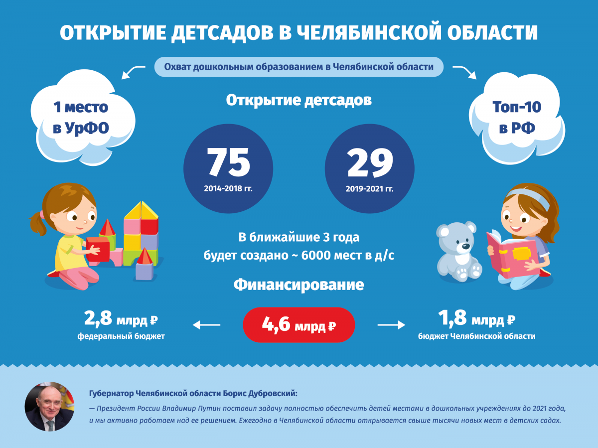 В период с 2019 по 2021 год в Челябинской области будет построено еще 29 детских садов. На строительство дошкольных образовательных учреждений запланировано финансирование в размере 4,6 млрд рублей: 2,8 млрд рублей – из областного и 1,8 млрд рублей – из федерального бюджетов.