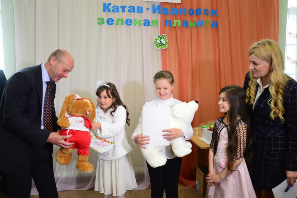 В возрастной номинации «7-9 лет» получать заслуженные награды вышли настоящие принцессы, в белом. За первое место (работа «Яблони в цвету») Мария Никитина получила большого белого медведя, которого назвала Пумкой. Серебряный призёр Варвара Агафонова (работа «Цветочная поляна») приняла в свою коллекцию красивого зайца-спортсмена. А бронзовому призёру Елизавете Симора (работа «Мир лучше экологической катастрофы») Олег Колесников подарил плюшевого бегемотика. Дети остались довольны, с радостью отвечали на вопросы и делились своим видением экологического будущего Катав-Ивановска. «Очень умные, серьёзные дети!» - говорит Олег Алексеевич.