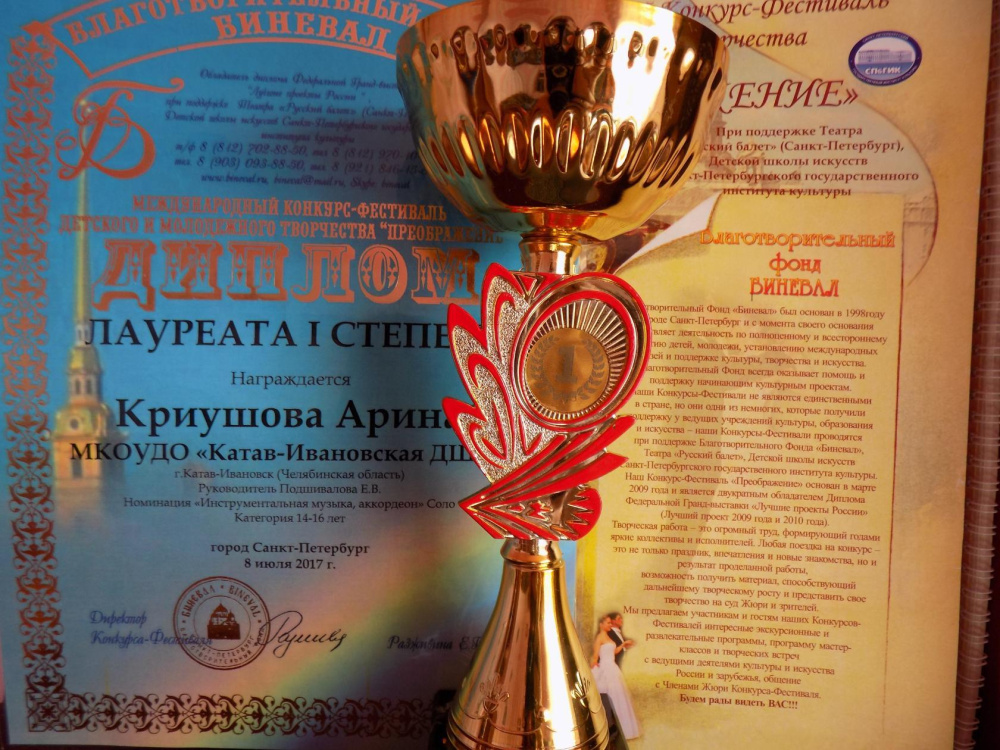 Елена Васильевна, Арина и её родители выражают огромную благодарность Главе Катав-Ивановского муниципального района Евгению Юрьевичу Киршину за поддержку и оказанную помощь, давшие возможность Криушовой Арине принять участие в Международном Конкурсе-Фестивале детского и молодежного творчества «Преображение» «Белые ночи» в городе Санкт-Петербурге с 5 по 9 июля 2017года. Без помощи и поддержки Евгения Юрьевича эта поездка не состоялась бы.