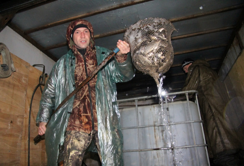 — Для ее транспортировки необходимы специальные емкости, — рассказывает Андрей Хортов. — Из пруда рыбопитомника вылавливаются сачками мальки, затем они помещаются в эти огромные баки. Для того, чтобы рыба хорошо перенесла переезд, ей необходим кислород, который из баллонов запускают в емкости. Мы приобрели 725 кг мальков. Одна особь весит примерно 50—60 граммов, то есть где-то около 15 тысяч маленьких карпов поместилось в эти два бака.