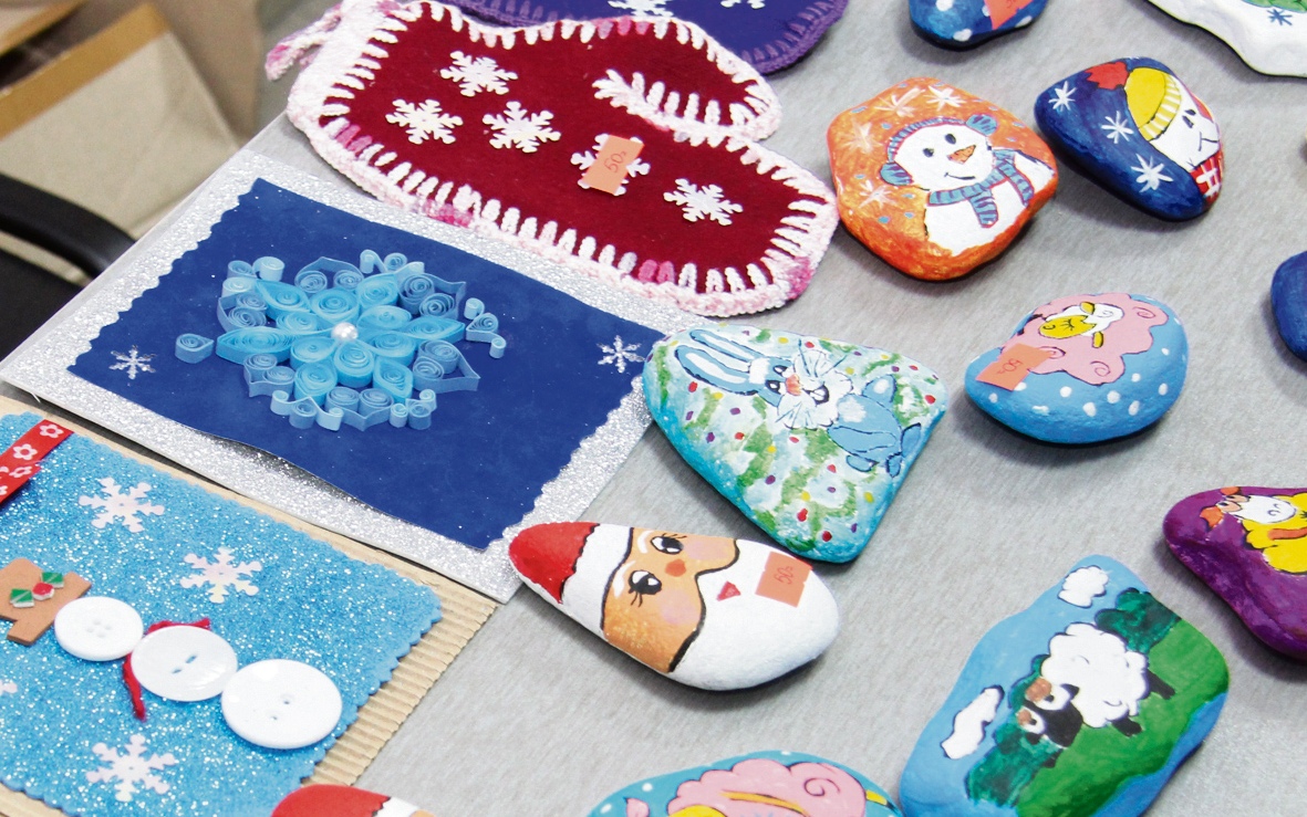 Глаз так и тянулся к картинам, выполненным на обычных камнях. Даже огромный булыжник был превращен в новогодний подарок. Фигурки кораблей, машинок, звезды, розочки оказались мылом ручной работы. Причем в каждый кусочек мыла были добавлены травки, чтобы сделать умывание приятным и полезным. Совы, домики, варежки из фетра долго, наверное, шили ребята. А рядом примостились выпиленные из фанеры ангелочки, овечки, елочки, украшенные сверкающими паетками. Открытки из бисера, снеговики из пуговиц, гравюры. Цены на эти новогодние подарки были очень демократичными: от 50 до 250 рублей. Поэтому первые клиенты подошли к прилавкам, когда ребята еще только раскладывали свои работы. Тут же вышли из своих кабинетов и работники банка. А мальчишки и девчонки в красных новогодних колпачках, как заправские зазывалы, предлагали наперебой свой товар.