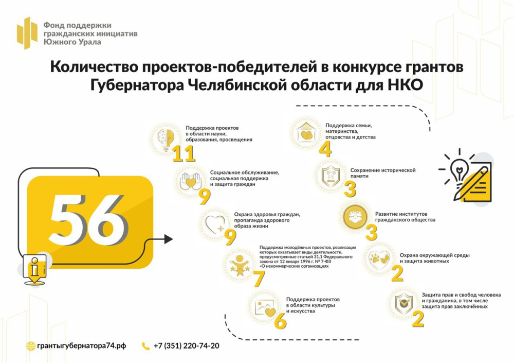 Победителями конкурса стали 56 инициатив социально ориентированных некоммерческих организаций региона, реализация которых начнется уже с 1 октября. Они получат грантовую поддержку на сумму более 43 млн. рублей. Среди победителей 3 НКО с 2-мя проектами. По правилам конкурса им придется выбрать только один проект для реализации на средства гранта Губернатора Челябинской области.