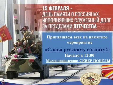 У России много дат, которые напоминают нам о мужестве и отваге наших солдат! И одной из так дат является 15 февраля! В этот день мы будем отмечать День памяти о россиянах, исполнявших служебный долг за пределами Отечества и 35-летие со дня вывода советских войск из республики Афганистан!