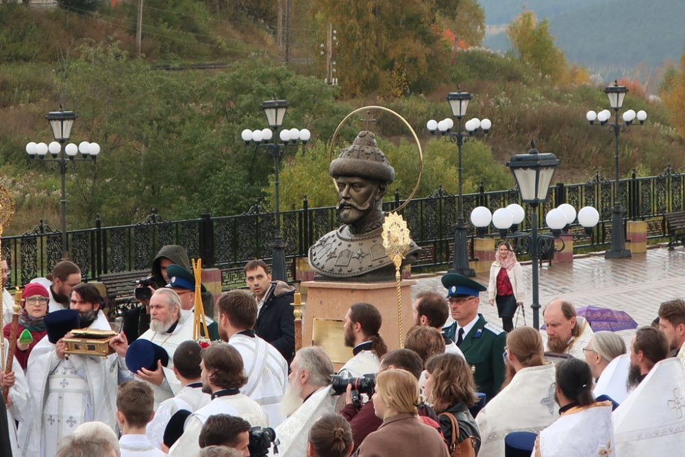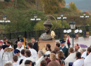 Потом все участники Божественной литургии Крестным ходом направились к памятнику Николаю II, который удачно вписался в архитектурный ансамбль Серафимовского собора. Известно, что в 2018 году исполнилось 150 лет со дня рождения российского императора-страстотерпца, а также 100 лет со дня его убиения. Поэтому духовенством и общественностью горнозаводского края было предложено воздвигнуть памятное изваяние, которое бы напоминало каждому о значении жертвенного подвига царя Николая Второго и его семьи, о возрождении государственности и об объединении общества. Бюст изготовлен саратовским скульптором А.А.Садовским, позолоченный нимб делали на Златоустовской оружейной фабрике. К свидетелям сегодняшней истории обратились митрополит Челябинский и Миасский Никодим, заместитель губернатора Челябинской области Евгений Голицын, оба оратора подчеркнули важность происходящего для духовной жизни Златоуста и всей Челябинской области. Чин освящения памятника совершили почётные гости торжества – митрополиты Викентий и Никодим. Господь благоволил событию с неба и окропил всех тёплым сентябрьским дождём…