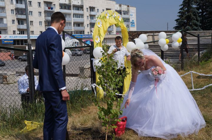 Также все молодые люди в этот день посадили на поляне возле Дворца культуры березки. Кстати, каждое деревце — именное, на нем повешена табличка с указанием даты свадьбы и инициалов семейной пары. Издревле на Руси существовала традиция сажать деревья в день свадьбы. Таким образом молодожены закладывали основу для своего будущего счастья и семейного благополучия. Первой парой, посадившей дерево любви, стала семья Ветровых. Так что возле Дворца культуры появился теперь небольшой сад из молоденьких березок. Надеемся, что эти деревья станут символом многолетней семейной жизни, и с каждым годом их будет становиться все больше и больше. А еще среди новобрачных прошел обряд на определение пола будущего ребенка. Мужу предлагалось выбирать ленточку, которая находилась за спиной в руке ведущей. Розовая — значит, будет девочка, голубая — мальчик. Затем молодому человеку нужно было завязать ее на дереве. Сопровождалось это действо песней в исполнении вокальной группы «Родник».