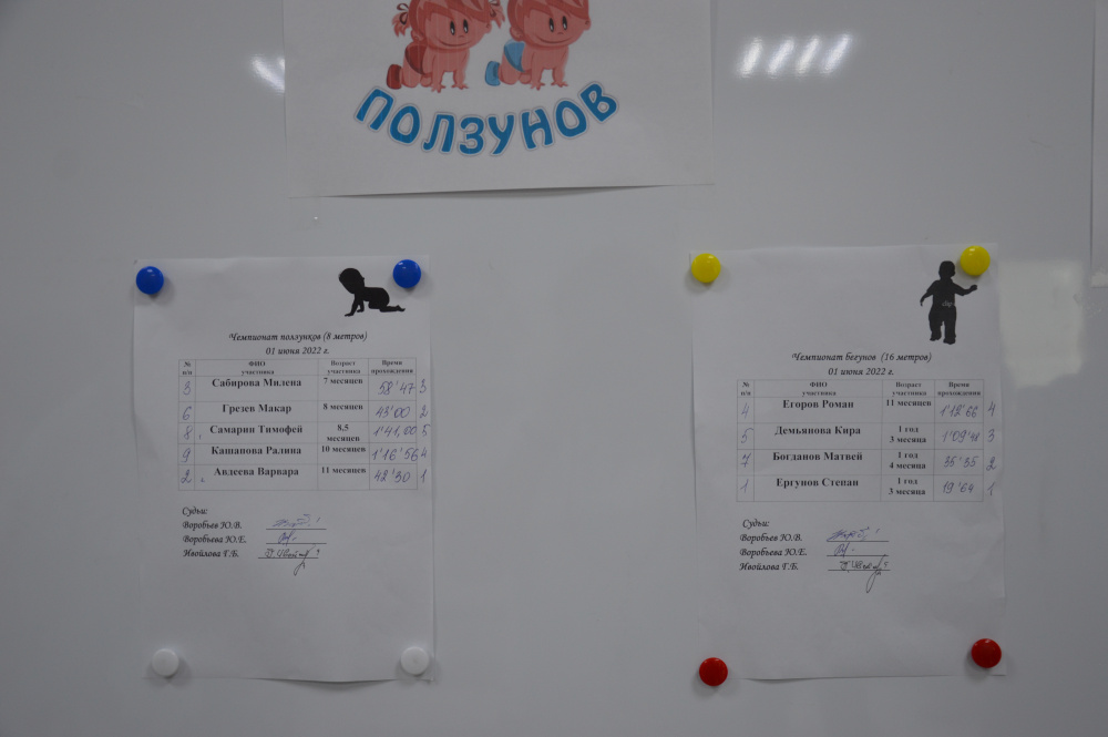 В «Чемпионате ползунков» на дистанции 8 метров победила Варвара Авдеева (11 месяцев), а в «Чемпионате бегунков» на дистанции 16 метров победу одержал Степан Ергунов (1 год 3 месяца).