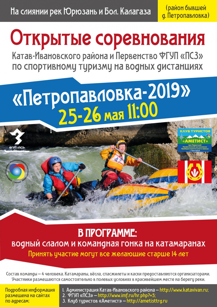 Сообщаем, что открытые соревнования по спортивному туризму на водных дистанциях Катав-Ивановского муниципального района и открытое Первенство ФГУП «ПСЗ» по спортивному туризму на водных дистанциях состоятся 25-26 мая 2019 года в районе урочища Петропавловка за деревней Меседа, Катав-Ивановского района, Челябинской области.