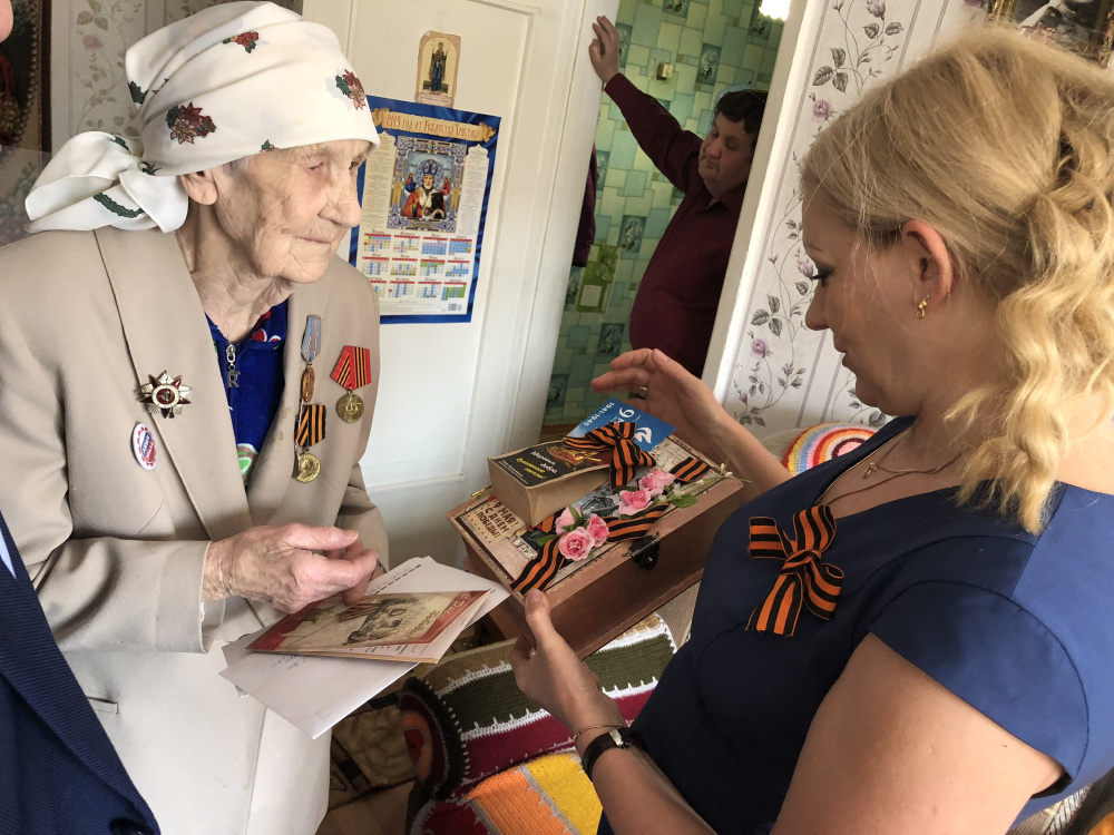 Вдова участника Великой Отечественной Фёдора Ивановича Лебедева встретила нас как своих родных людей. С утра выбирала платье для фотографии, а потом велела принести её накидку с медалями. Полный комплект!12 июня ей исполнится 90 лет. Она с теплотой принимала подарки, благодарила. А на прощание по традиции спела нам песню. Память у неё отличная!