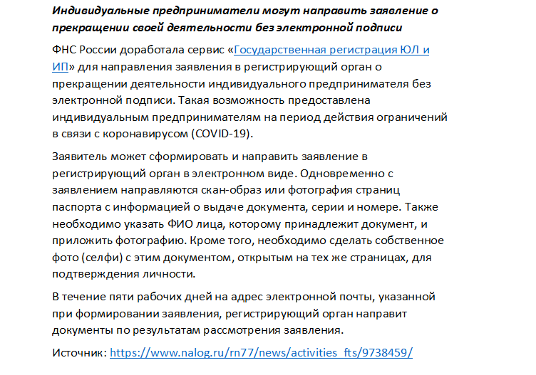 | Индивидуальные предприниматели могут направить заявление о прекращении своей деятельности без электронной подписи (35.35 КБ) | 35.35 КБ |