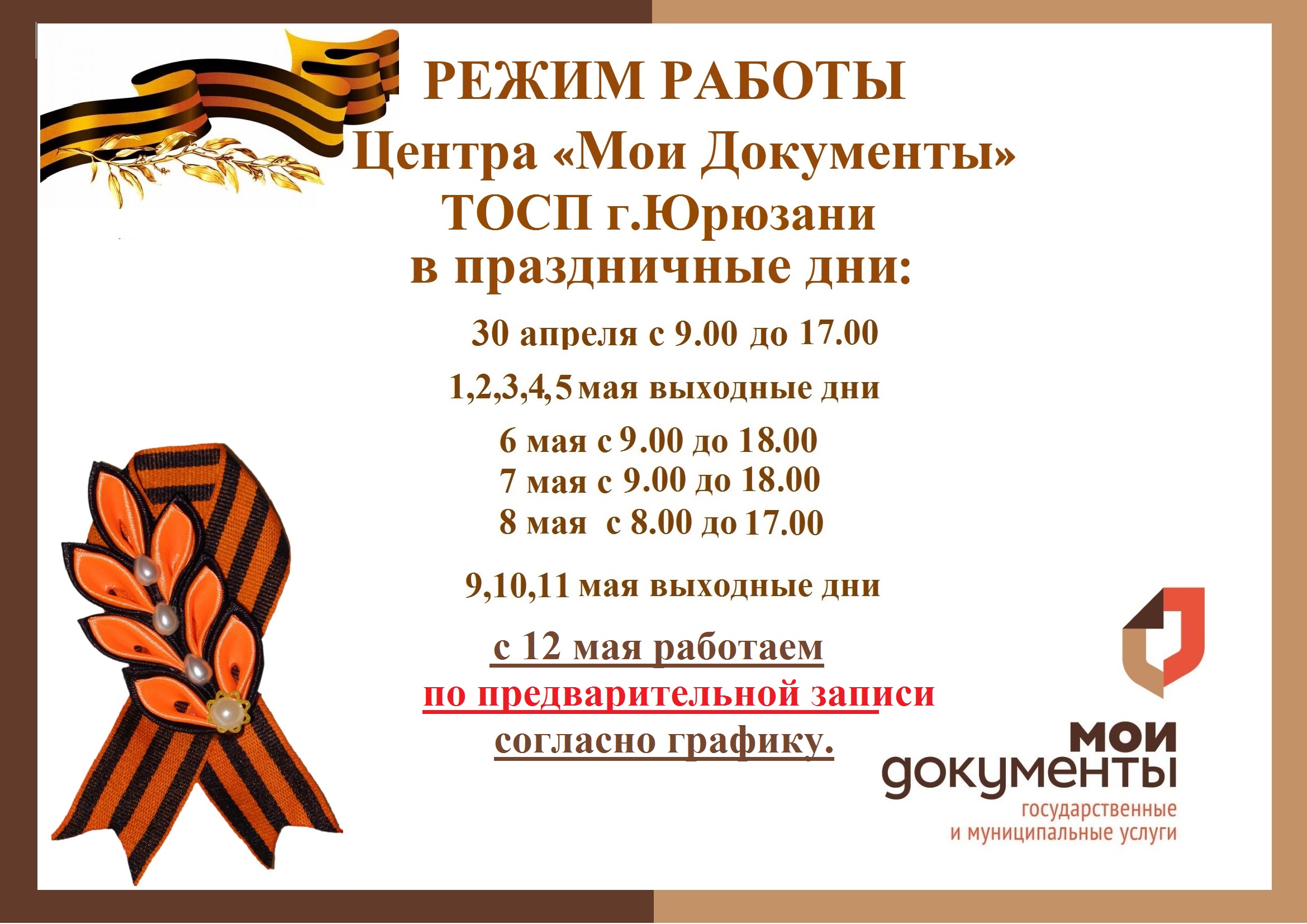 | Режим работы центра "Мои документы" ТОСП г.Юрюзань в праздничные дни (603.17 КБ) | 603.17 КБ |