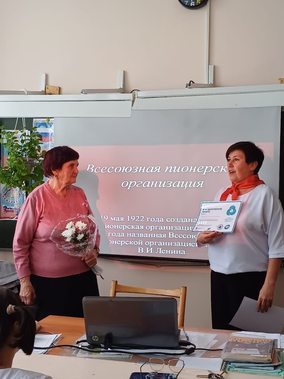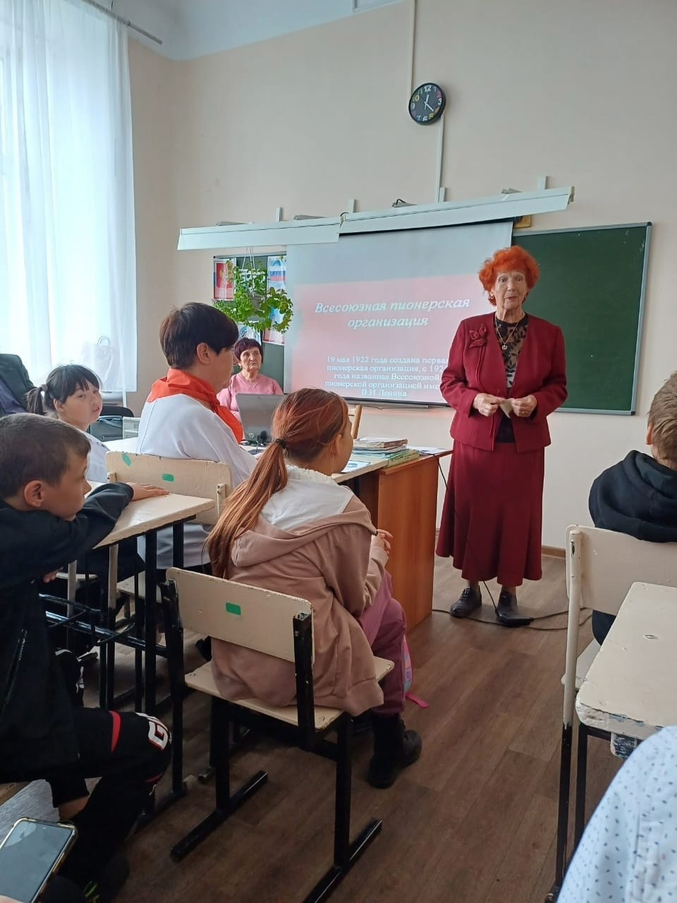 28 сентября в школе - интернат прошла встреча с ветеранами пионерского движения, Скомороховой Маргаритой Ивановной и Киселевой Идой Петровной. Они рассказывали нам о своих школьных годах, как повязывали красный галстук, звук горна и бой барабана на торжественных линейках, веселый отдых в летних лагерях, школьные стенгазеты и песни у пионерского костра.