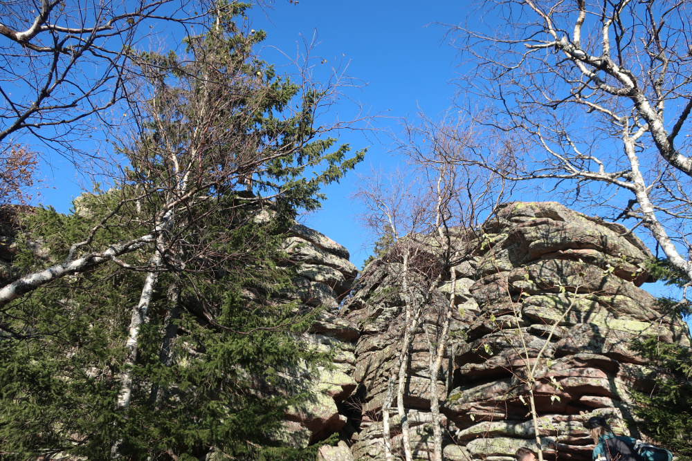 Еще два десятка минут – и мы у скал «Два брата». Красота неописуемая! Поднимаемся, делаем снимки и по лону торфяника, покрытого карликовыми берёзами, движемся к цели.