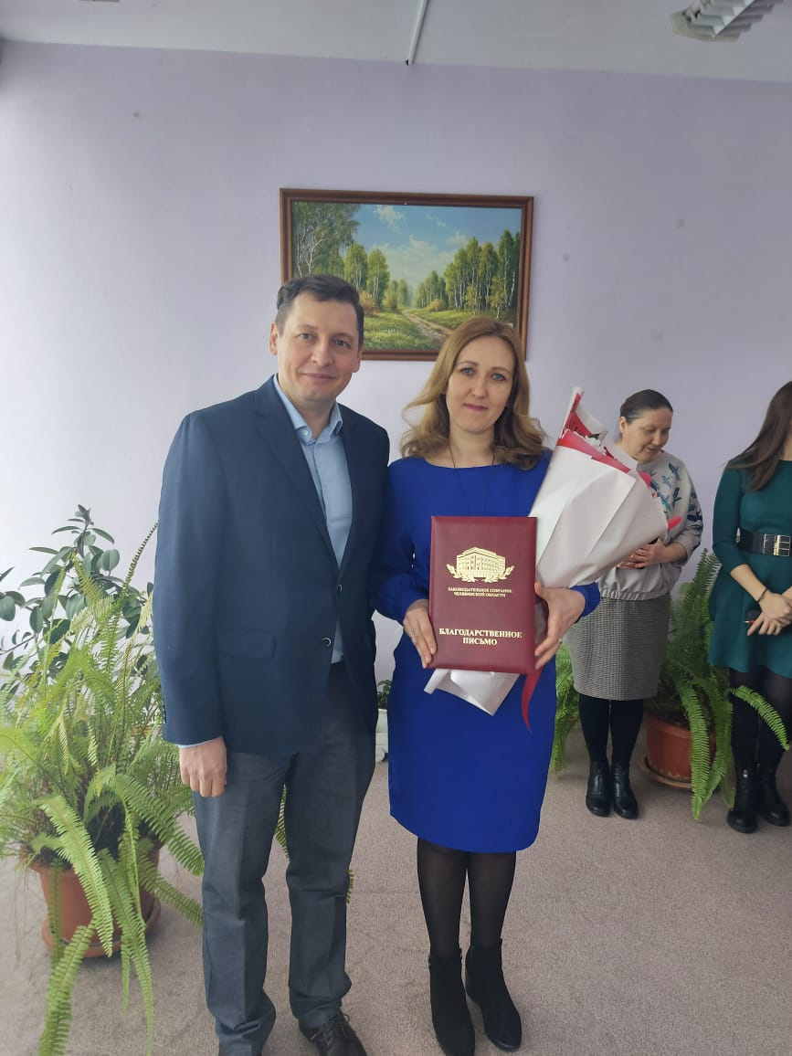 Леонид Урмашов вручил учителю географии Екатерине Микериной Благодарственное письмо Законодательного Собрания за многолетний и добросовестный труд.