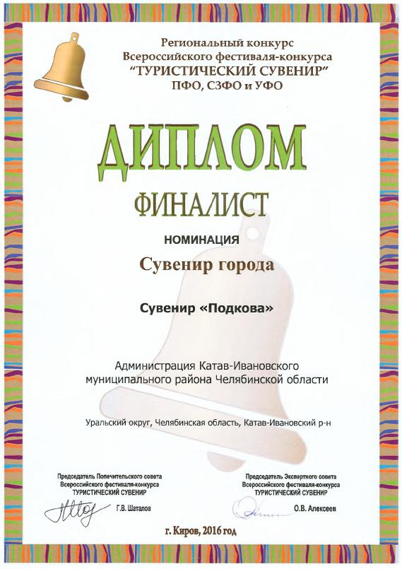 В номинации «Сувенир города» в средней ценовой категории третье место разделили сувенир «Подкова» из Катав-Ивановского района и сувенир «Колокольчик» из Уфы. Призеры регионального конкурса приглашаются в финал Всероссийского фестиваля-конкурса «Туристический сувенир», который состоится в октябре в Ярославле.