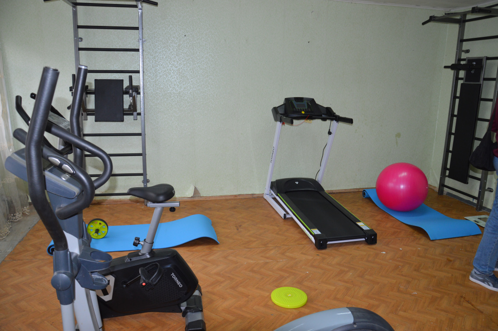 Людмила Геннадьевна рассказала об имеющихся в зале тренажёрах и спортивном оборудовании. Своими силами члены общественной организации установили беговую дорожку, велотренажер, шведские стенки, брусья и турник для подтягивания, тренажер «гребля». Так же в рамках проекта общество инвалидов получило дартс, ролик для пресса, экспандеры, гантели, скакалки, фитбол, гимнастические коврики и напольные весы.