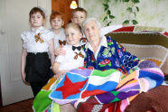 Ребята из детского сада №10, их воспитатели и представитель районной администрации вручили участникам войны пледы, связанные из «квадратиков теплоты»