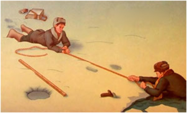 6) Осторожно вытащите пострадавшего на лед и вместе с ним ползком выбирайтесь из опасной зоны.